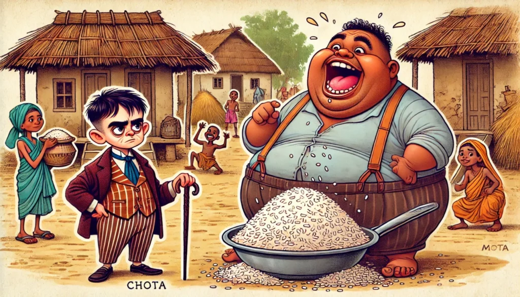ایک دن، چھوٹا اور موٹا نے مل کر گاؤں کے میلے میں جانے کا فیصلہ کیا۔ چھوٹا اکڑ کر ایسے چل رہے تھے جیسے میلہ خاص طور پر ان کے لیے لگایا گیا ہو۔ موٹا، تاہم، فوراً کھانے کے اسٹالز کی طرف لپکے، اور گرم چاول کے برتنوں کو دیکھ کر ان کی آنکھیں چمک اٹھیں۔